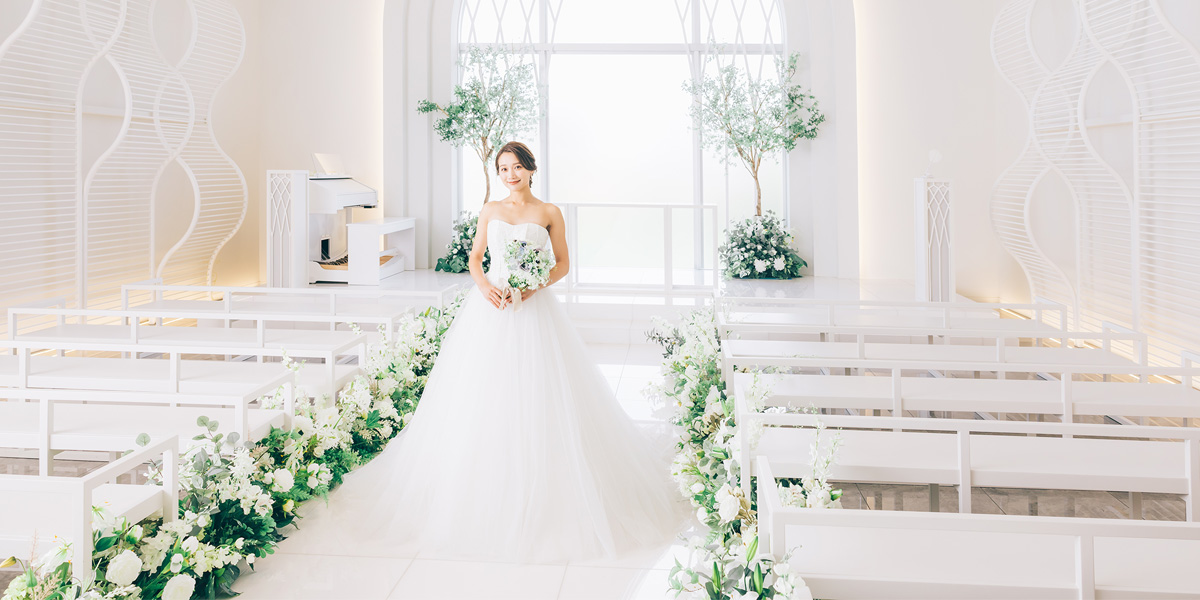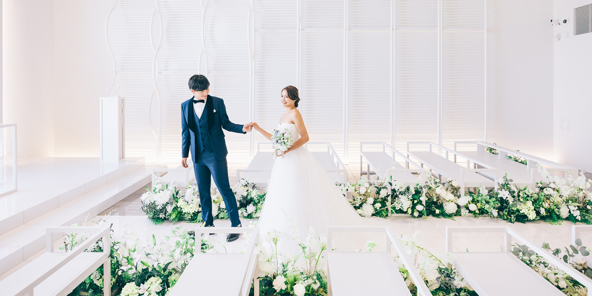 大自然光が差し込む大きな窓と、ヴェールをイメージした曲線が印象的なデザインの式場やスタイリッシュな中庭で100カット以上撮影します。憧れの教会ロケーション撮影が叶います。